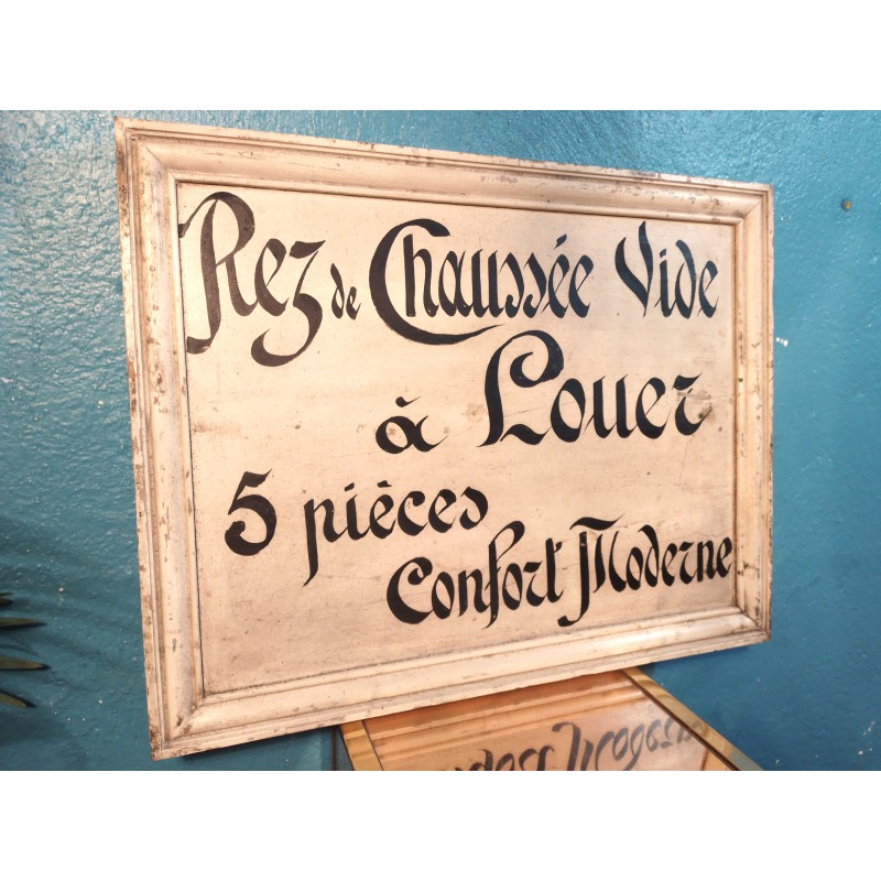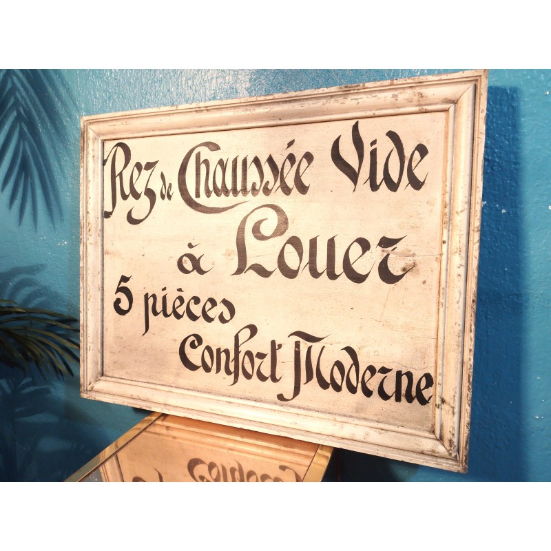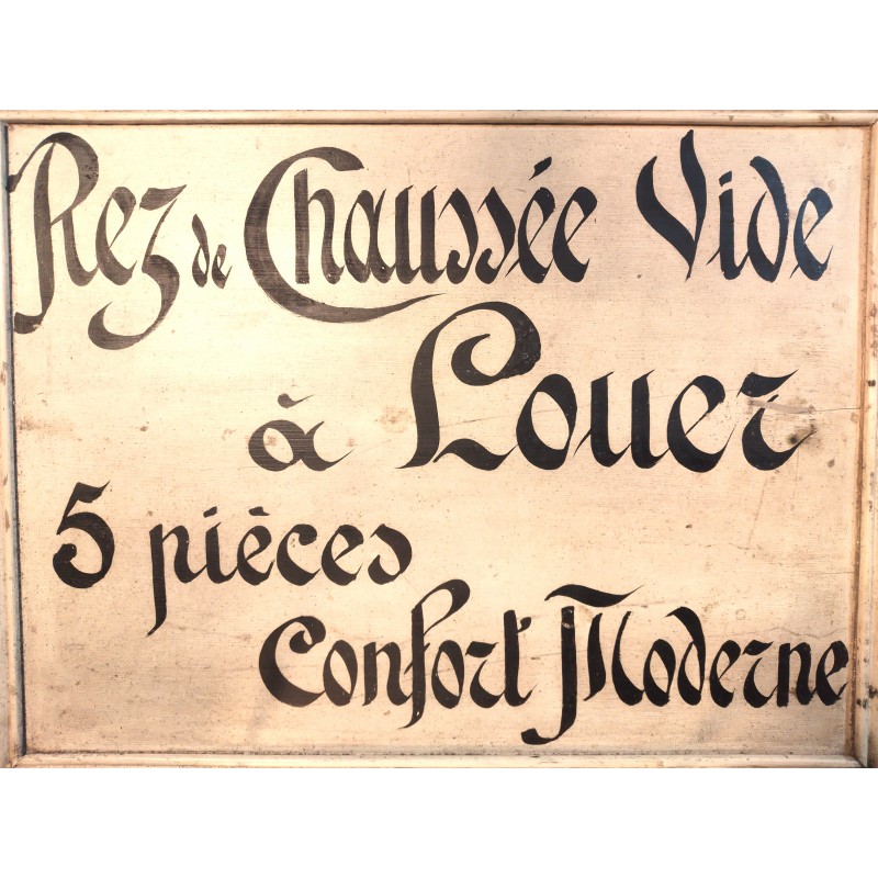 Retour aux années 50 avec ce joli panneau ! En bois, pour location d'appartement et plus précisément : " Rez de chaussée vide à louer, 5 pièces, confort moderne", sur fond beige, élégante typographie manuscrite couleur noir.. Vintage & décoratif, il est prêt à être installé !