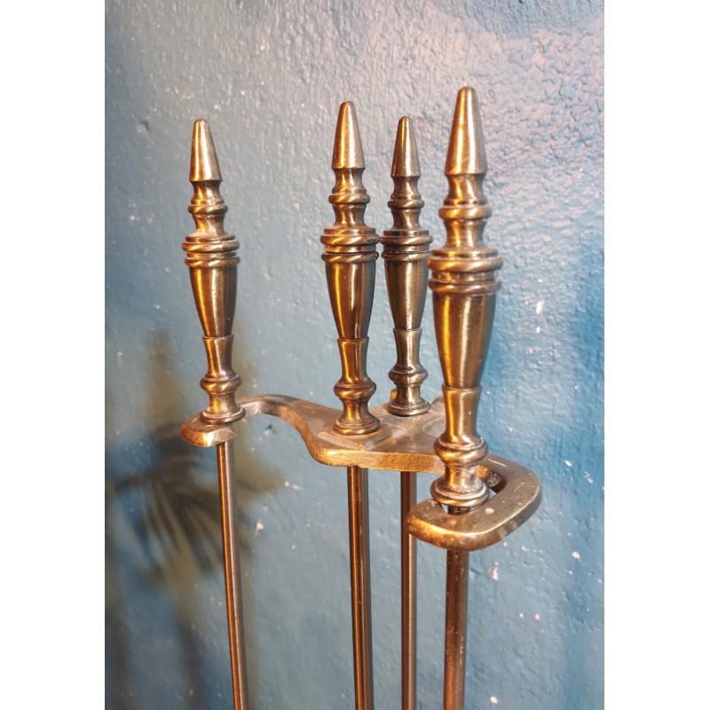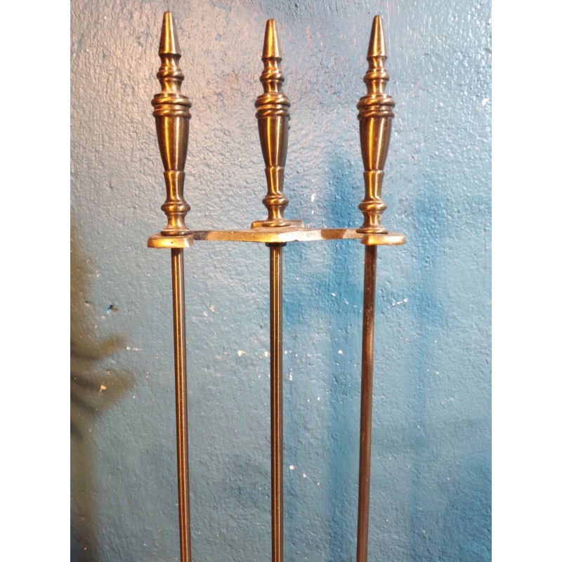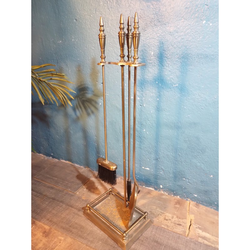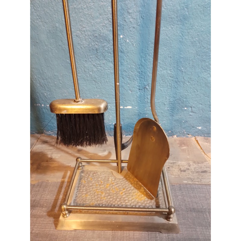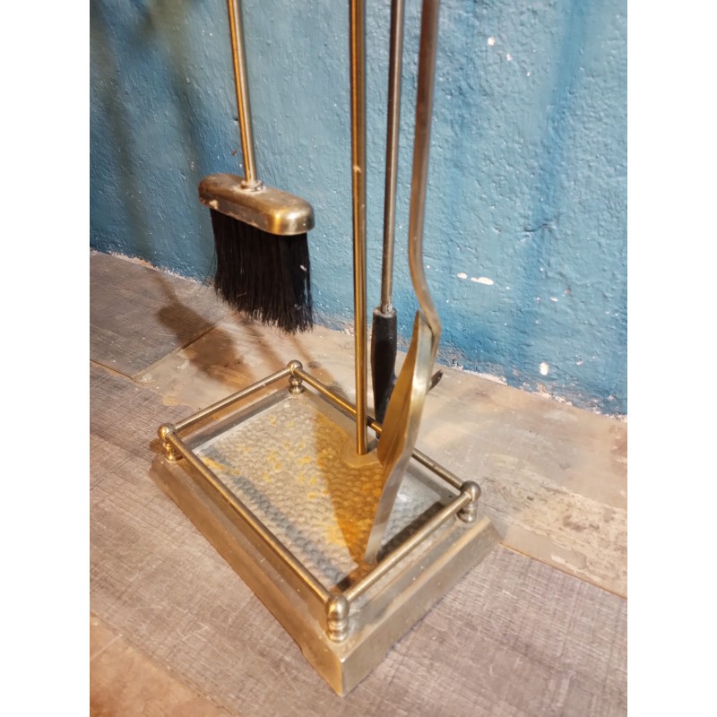 Joli nécessaire à cheminée des années 60 ! Un modèle aux lignes élégantes et classiques comprenant un support avec socle rectangulaire en métal chromé pour pelle, balayette et tisonnier à décor de pointe.. Un accessoire indispensable !