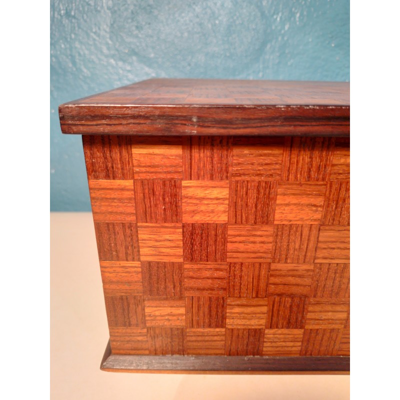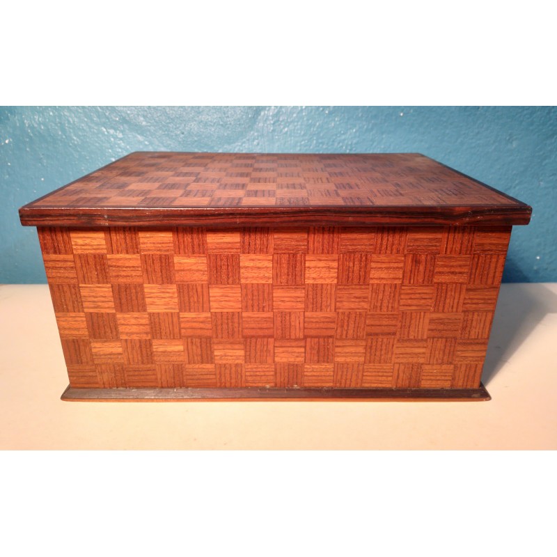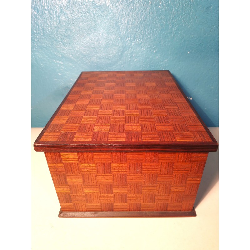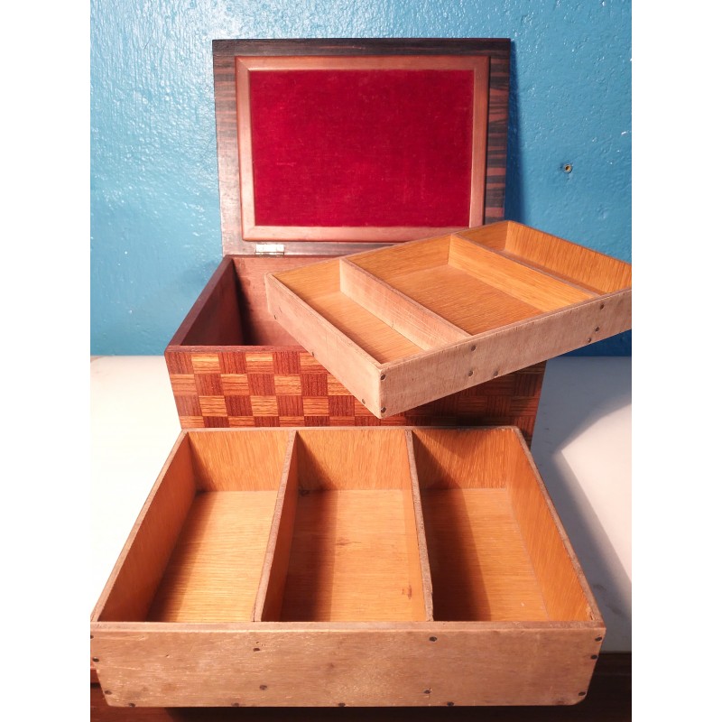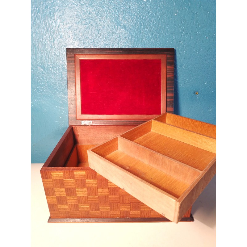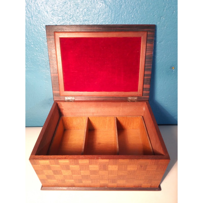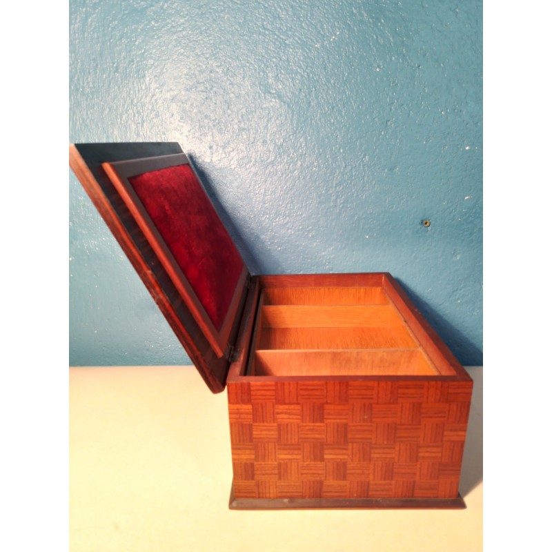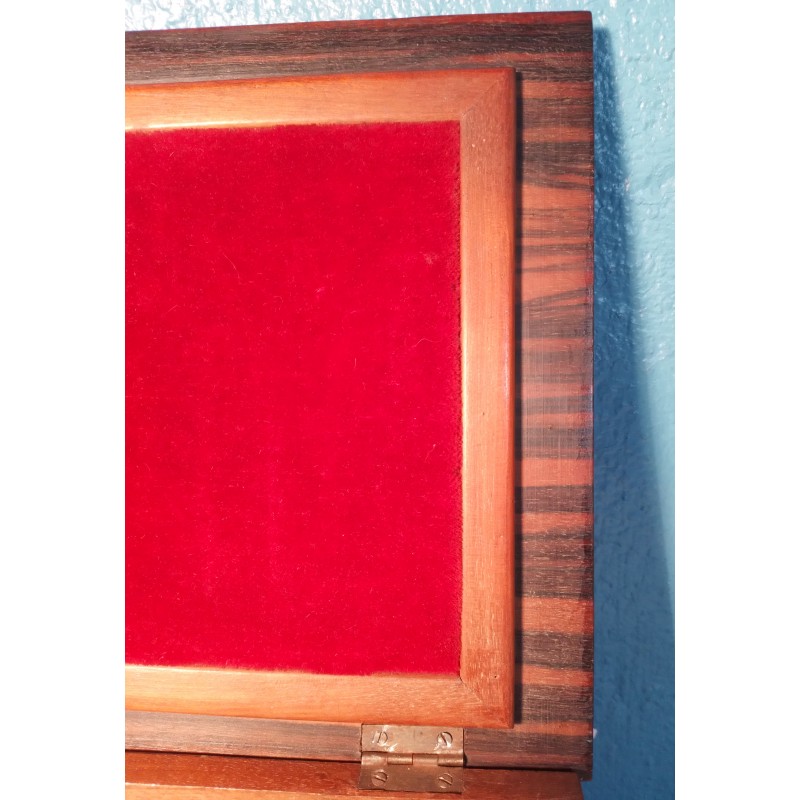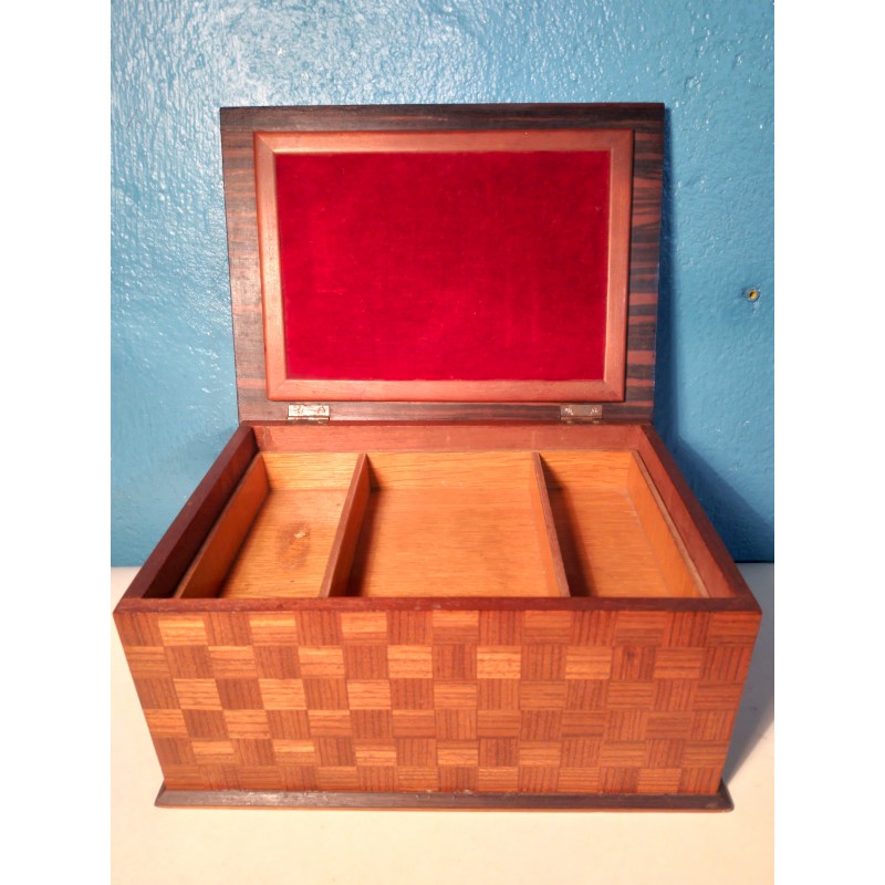 Ravissante boite à bijoux des années 50 ! Un modèle forme rectangulaire en ébène de Macassar et décor tressage en marqueterie de bois exotique, intérieur recouvert de velours rouge avec double compartiments amovible.. Elégante & décorative !