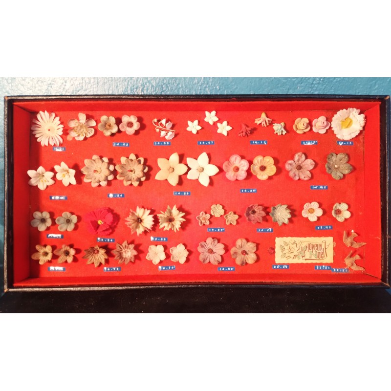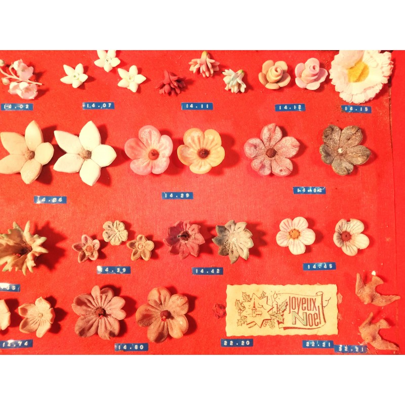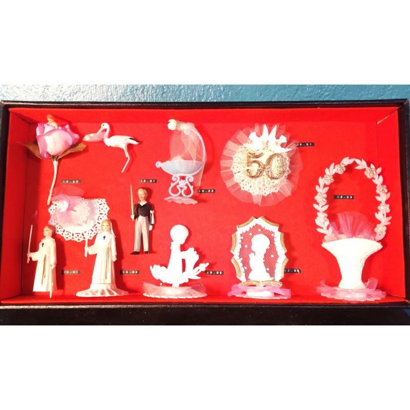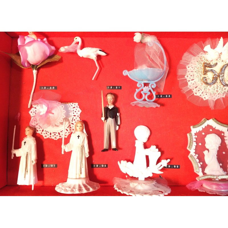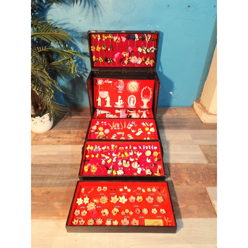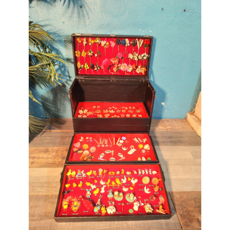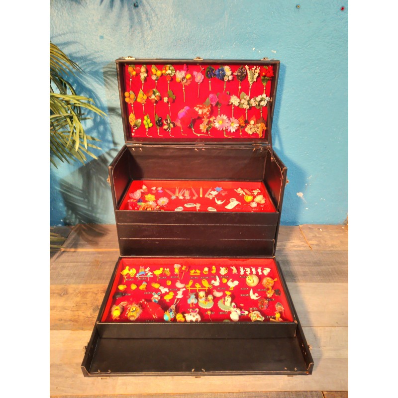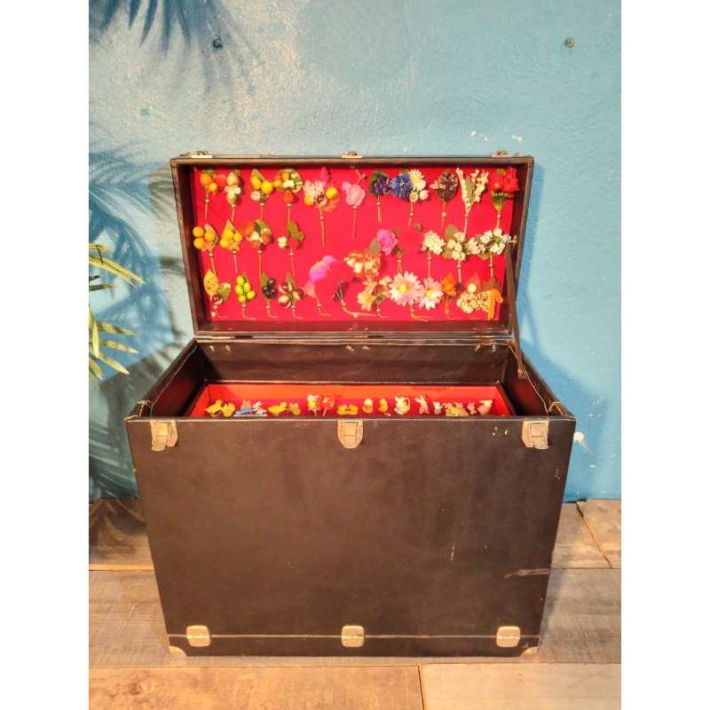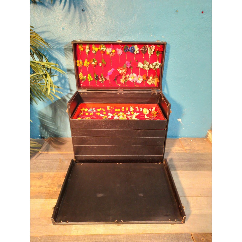 Rare & unique, superbe mallette de représentant de commerce pour décoration de gâteaux ! Propriété dans les années 60 de l'entreprise Midi Décor basée à Colomars (06670), elle servait à leur commercial afin de démarcher des boulangers, pâtissiers, traiteurs.. pour leur proposer des échantillons d'ornementation sur le thème des anniversaires, communion, baptême, Pâques ou Noël.. Structure bois forme cubique recouvert de simili cuir noir comprenant 5 compartiments amovibles avec une centaine de pièces référencées en plastique de différentes couleurs et collées sur feutrine rouge.. Très décorative, vous pourrez également monter votre propre bizness !!