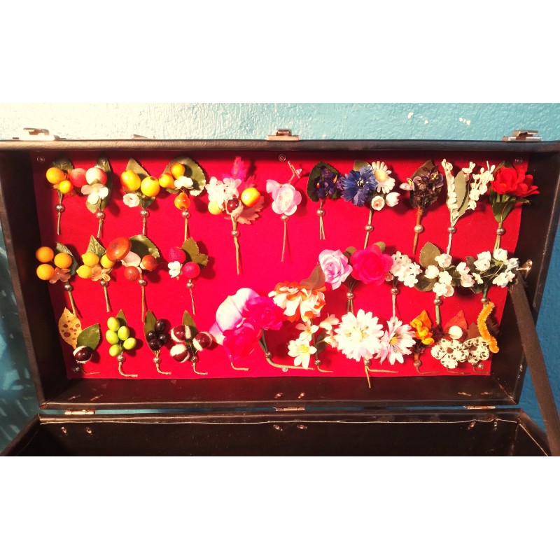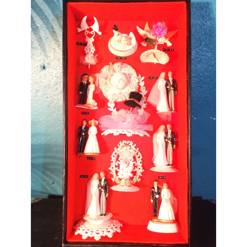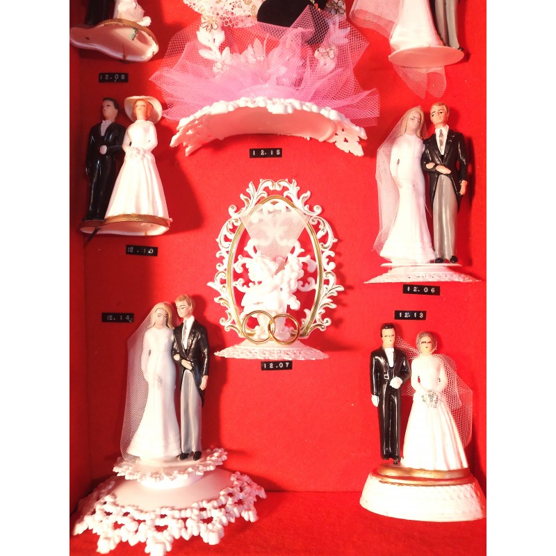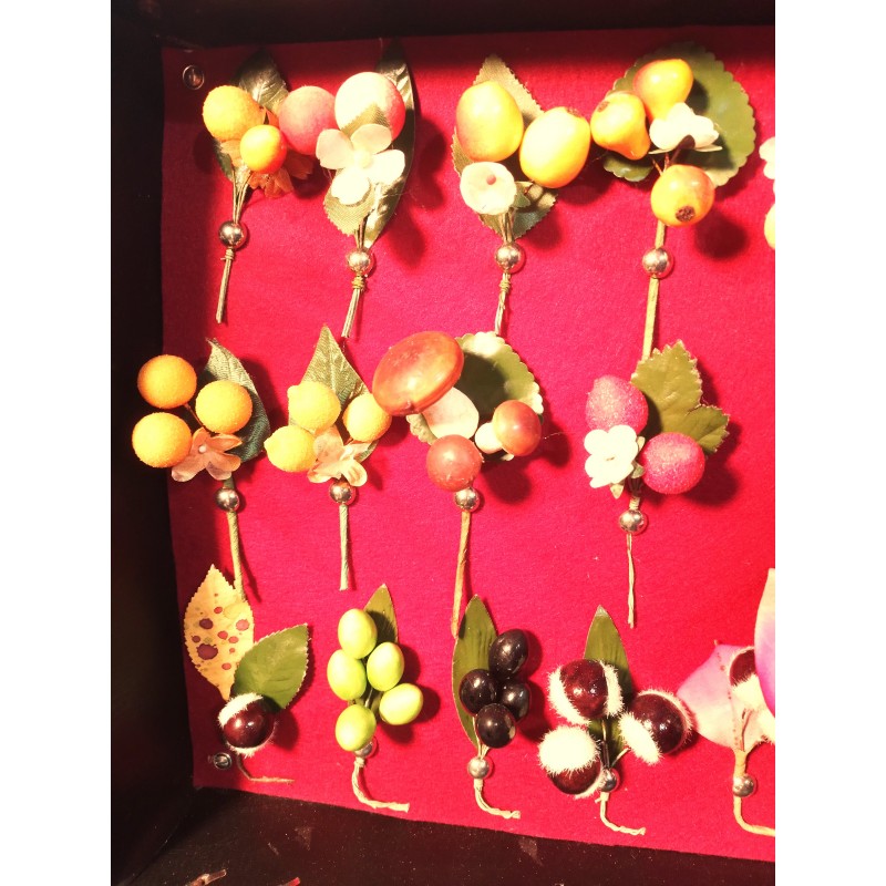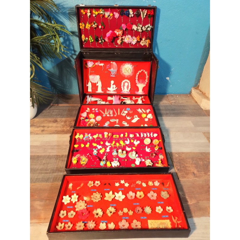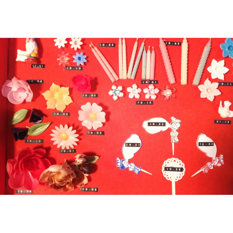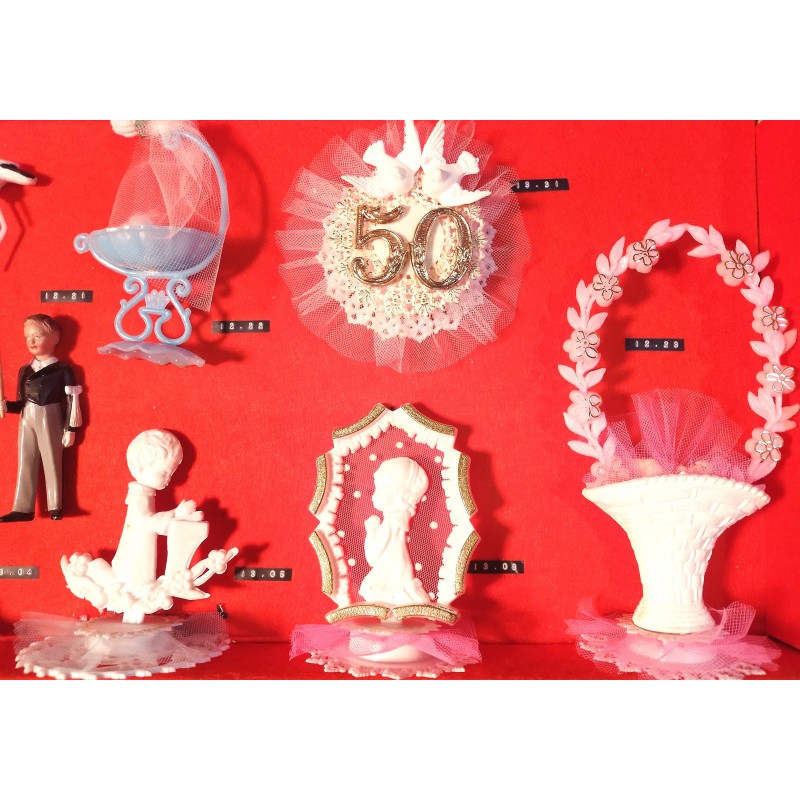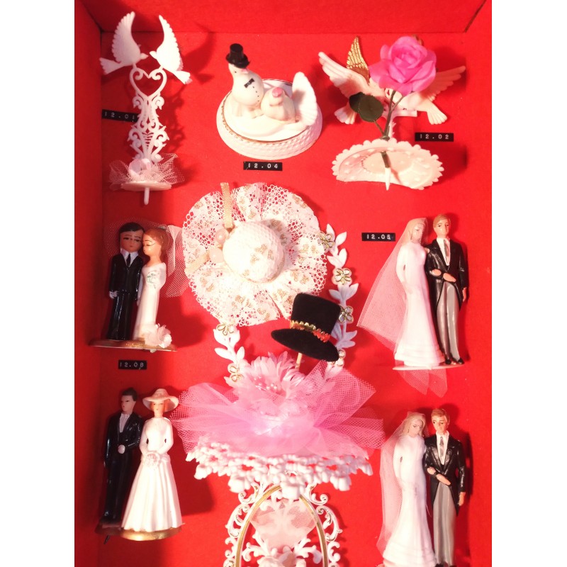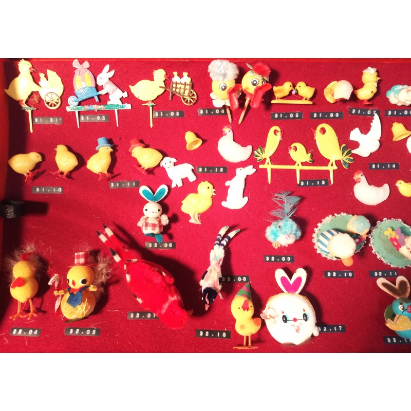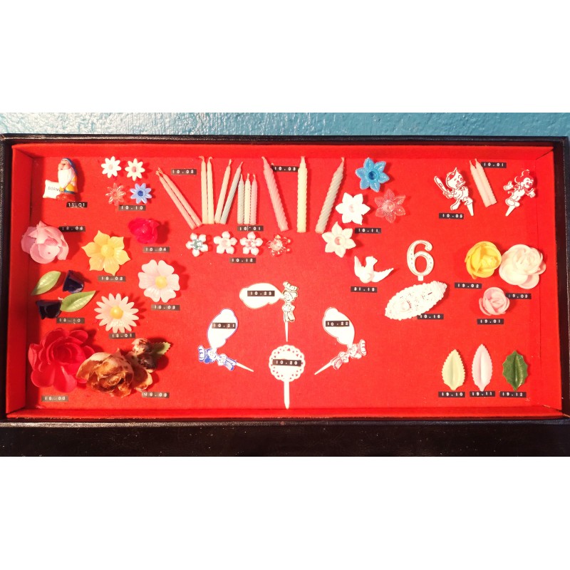 Rare & unique, superbe mallette de représentant de commerce pour décoration de gâteaux ! Propriété dans les années 60 de l'entreprise Midi Décor basée à Colomars (06670), elle servait à leur commercial afin de démarcher des boulangers, pâtissiers, traiteurs.. pour leur proposer des échantillons d'ornementation sur le thème des anniversaires, communion, baptême, Pâques ou Noël.. Structure bois forme cubique recouvert de simili cuir noir comprenant 5 compartiments amovibles avec une centaine de pièces référencées en plastique de différentes couleurs et collées sur feutrine rouge.. Très décorative, vous pourrez également monter votre propre bizness !!