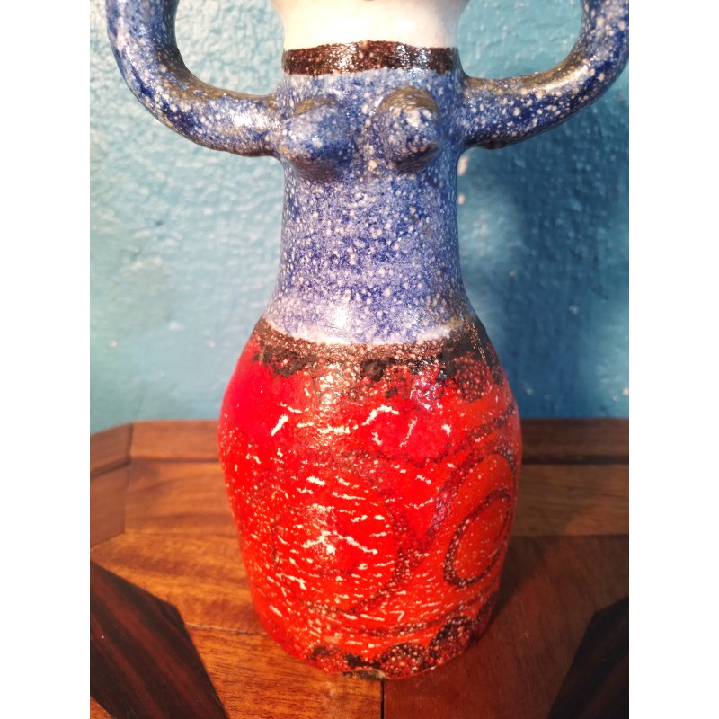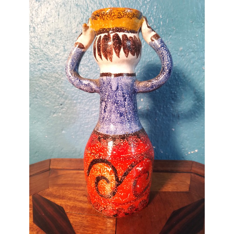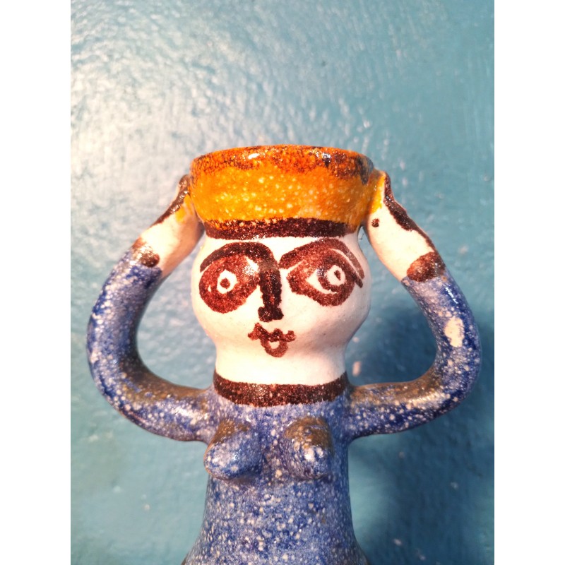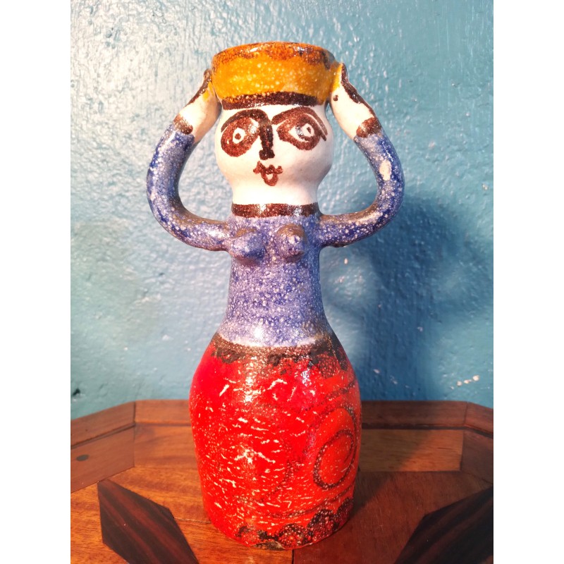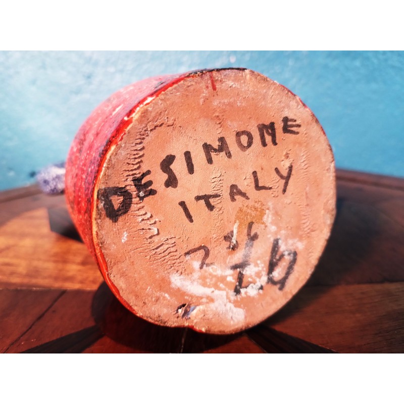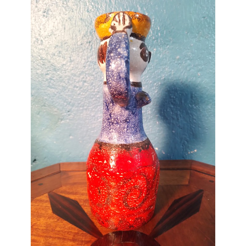 Etonnante carafe décorative des années 60 ! Signée du célèbre céramiste Sicilien Giovanni Desimone, modèle "femme porteuse d'eau" en terre cuite couleur rouge, jaune et bleu, signature manuscrite sous base.. Une pièce unique !