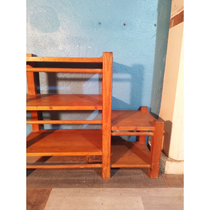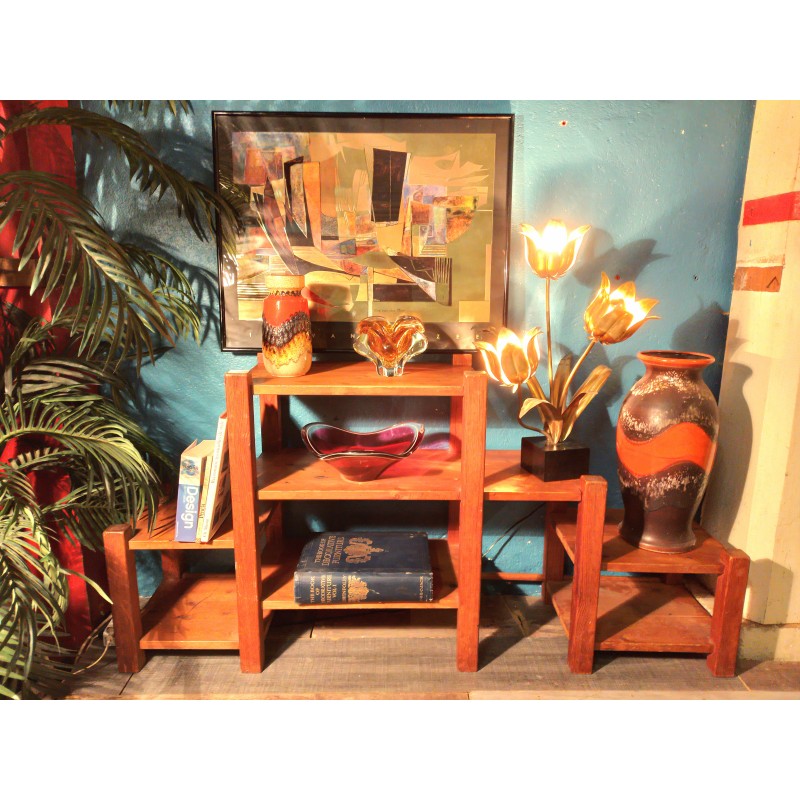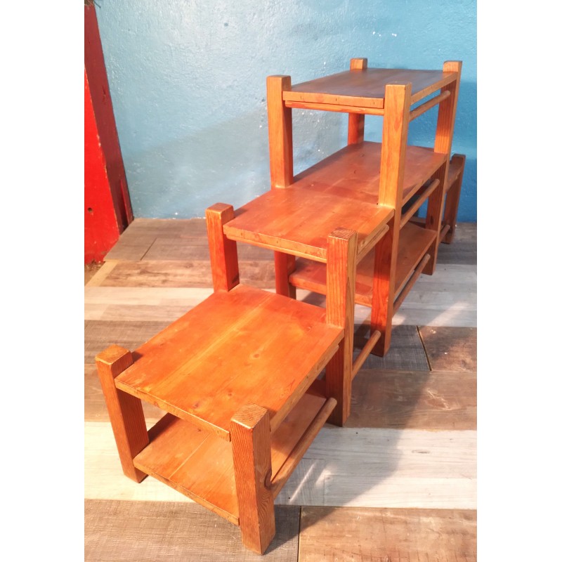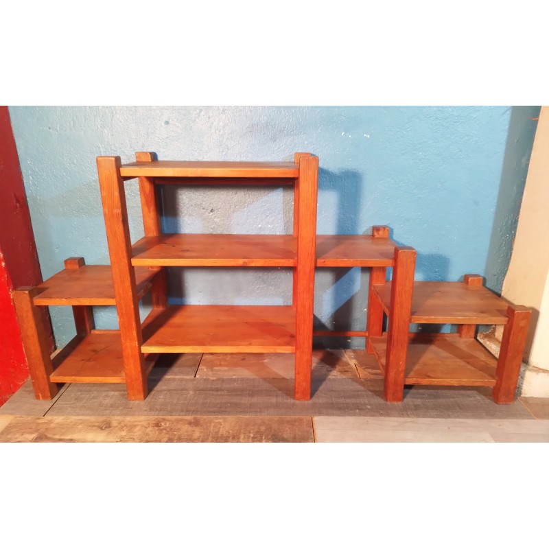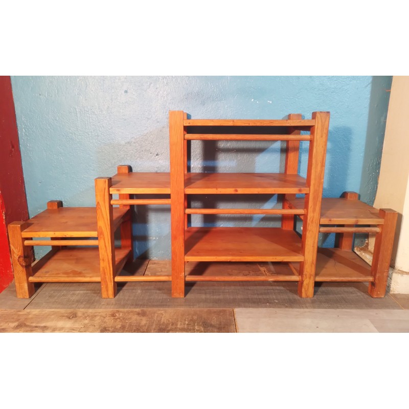 Le coup de coeur pour cette ravissante étagère ! Un modèle des années 70 aux lignes géométriques et brutes avec structure en pin formant 3 paliers de différentes hauteurs pour compartiments et étagères, barres de renfort.. Parfaite pour une décoration modulable !