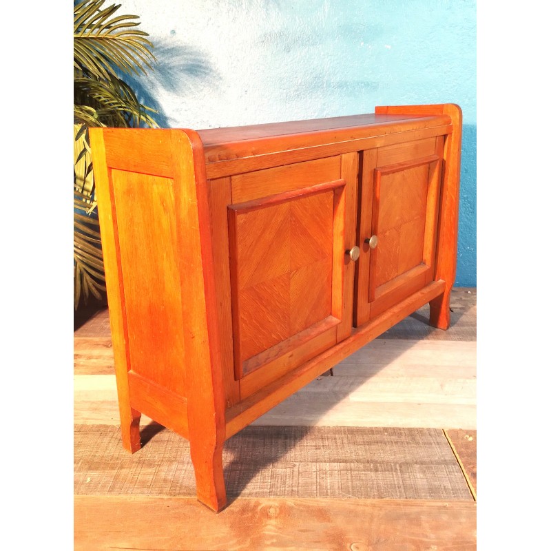 Le coup de coeur pour ce meuble bar ! Un élégant modèle des années 50 se composant d'une structure bois en placage de noyer, double porte à décor de marqueterie ouvrant sur une petite étagère pour verres et compartiment bouteilles, bordure courbée formant piétement et poignées métal.. Décoratif & pratique, ses petites dimensions lui permettront de trouver facilement sa place !