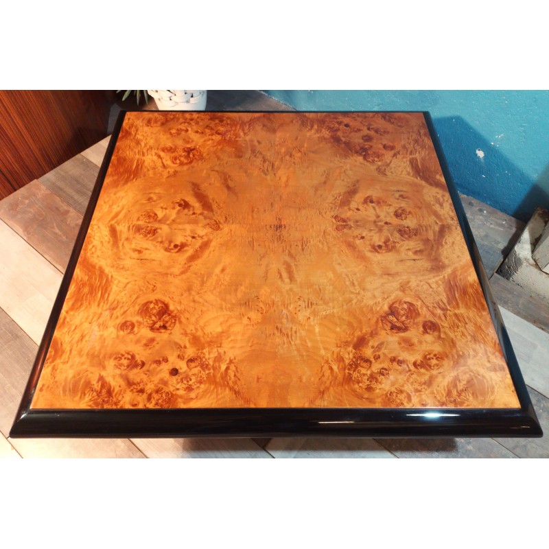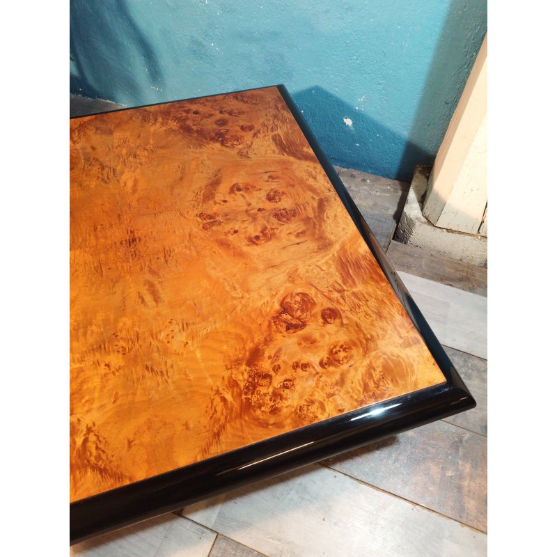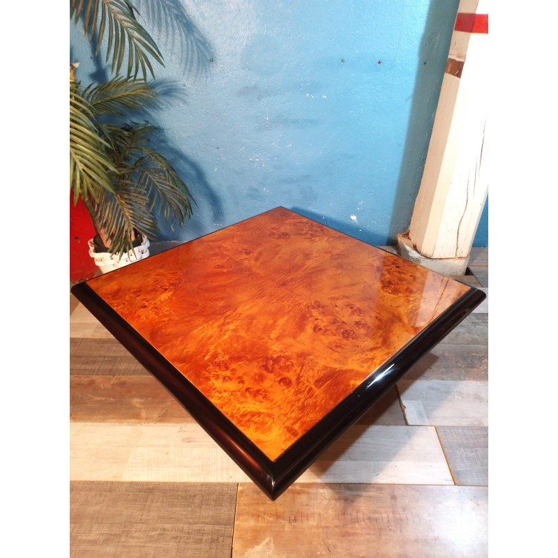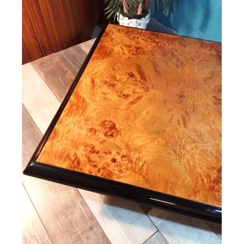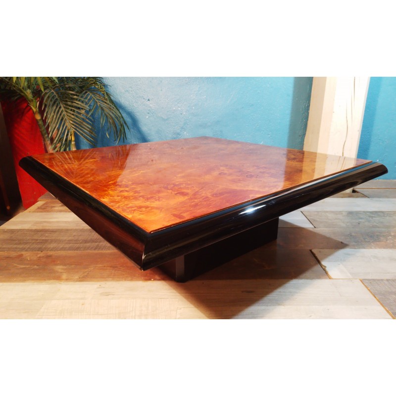 Retour aux années 70 avec cette superbe table basse ! Un modèle avec plateau forme carrée en placage de loupe d'orme verni formant de jolies lignes, noeuds et nuances contrastées selon la lumière, bordures courbées laqué noir pour un beau contraste et piétement central carré.. Elégante & décorative !