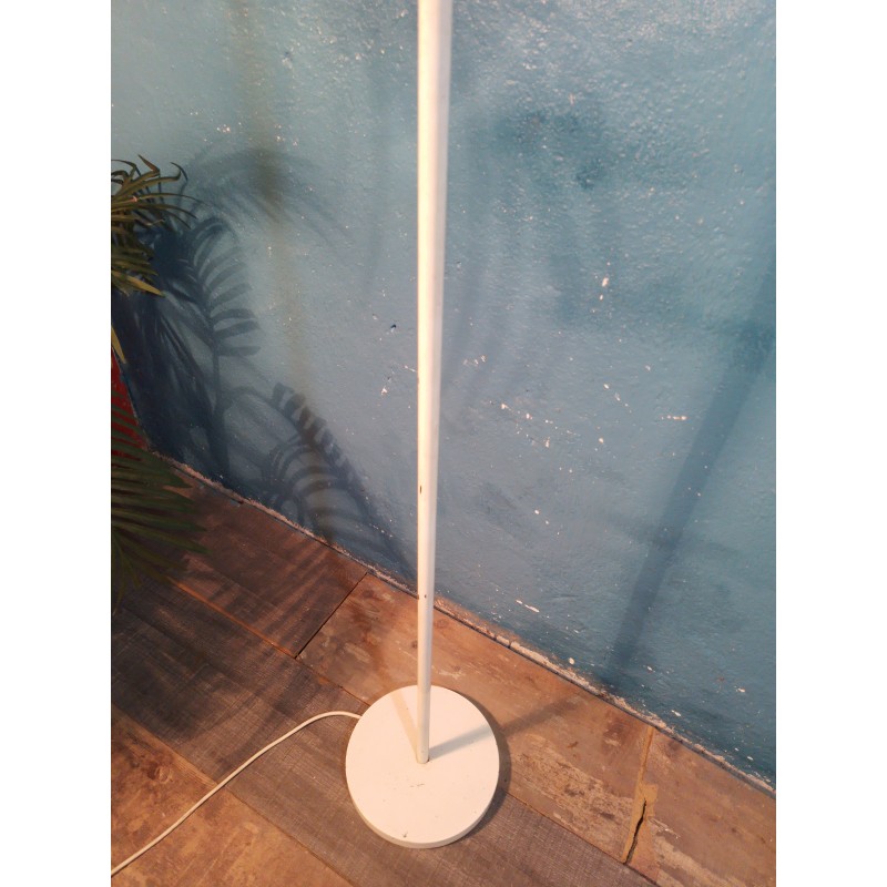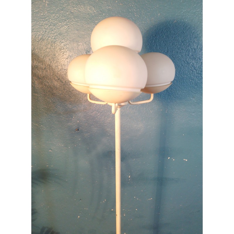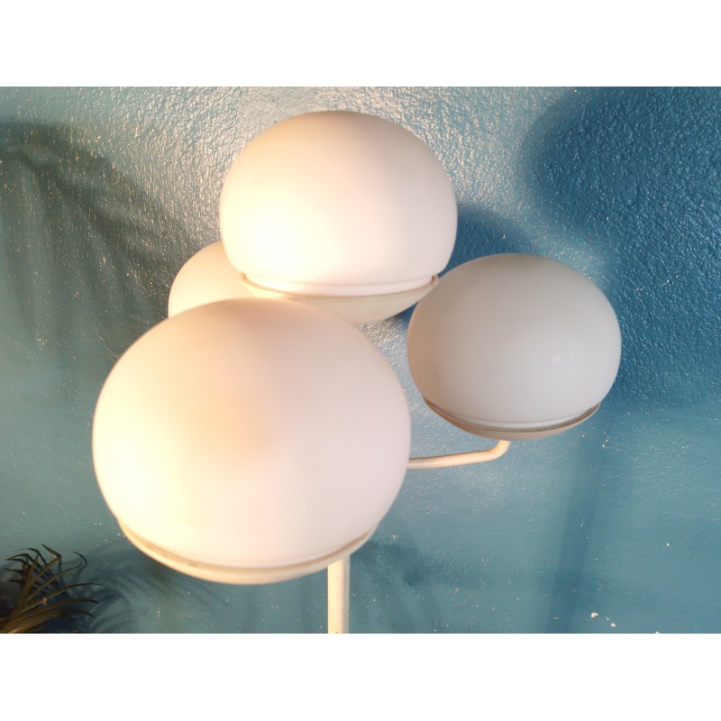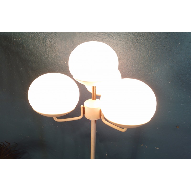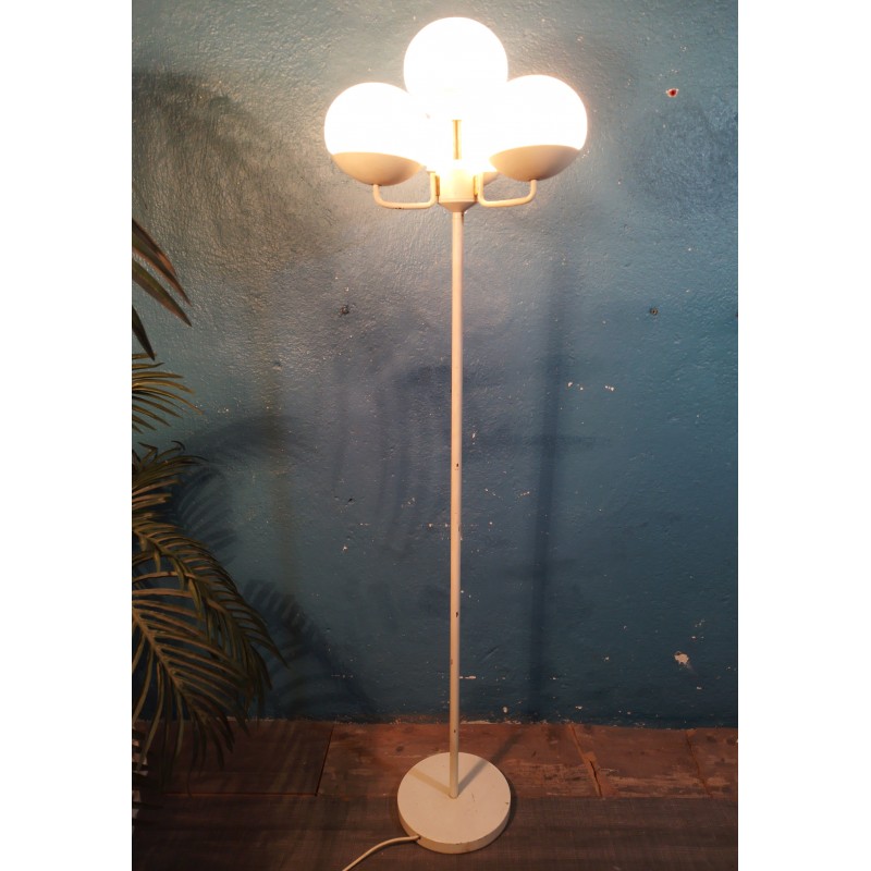Très joli lampadaire des années 60 ! Dans le goût d'un modèle conçu par la designer Eva Renée Nele pour les éditions Temde Leuchten (Suisse), luminaire se composant de 4 feux sur petits bras métal avec globe en opaline blanche pour une belle diffusion de la lumière, piétement tubulaire et base circulaire en métal blanc.. Une pièce rare & décorative !