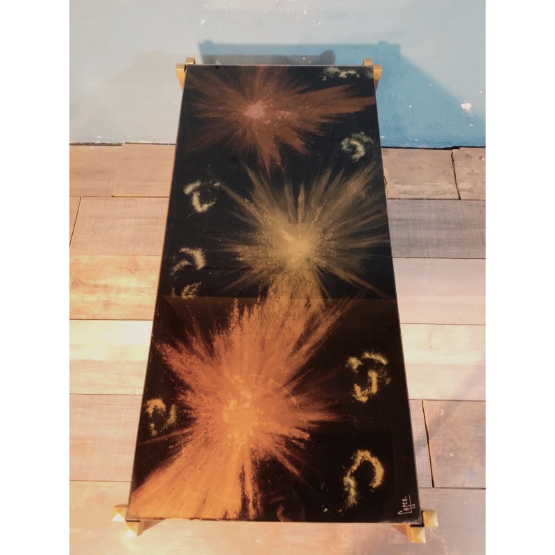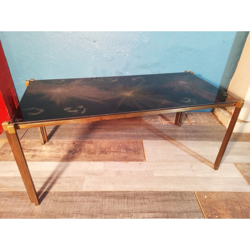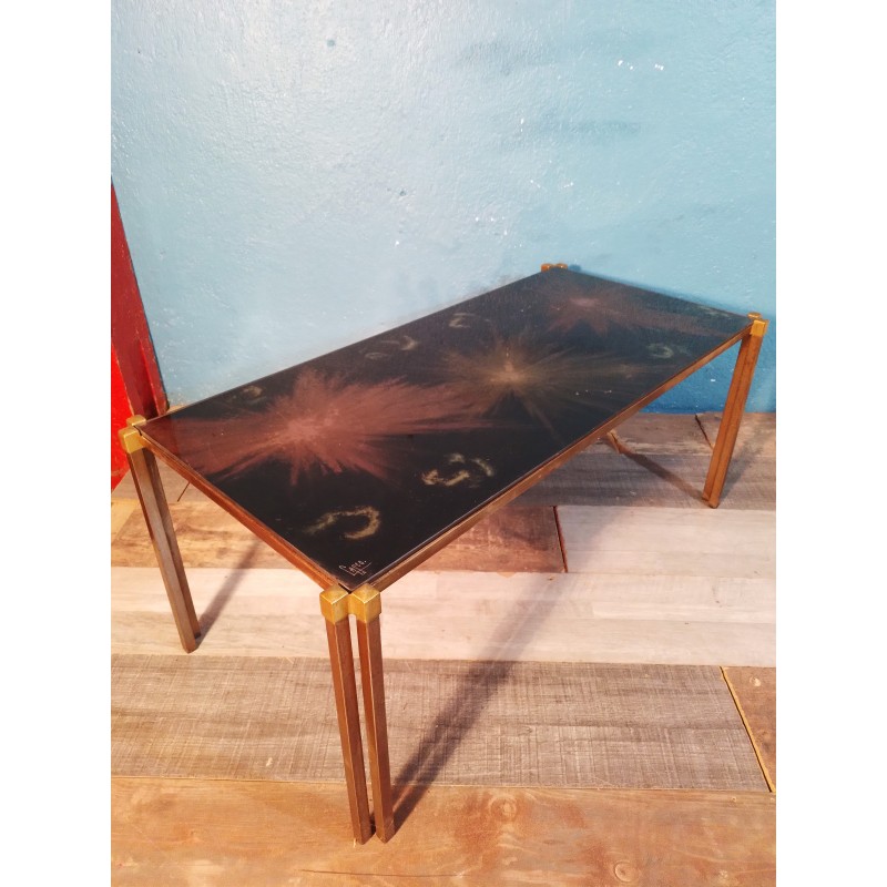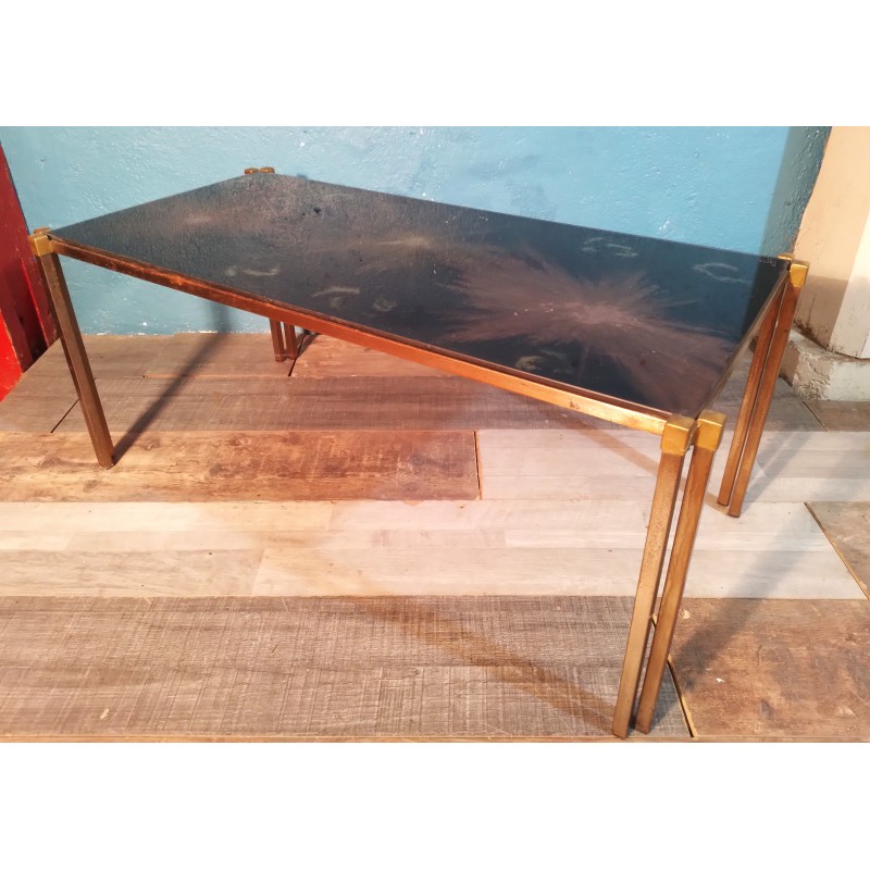 Ravissante table basse des années 70 ! Un modèle original signé Capco avec plateau verre forme rectangulaire à décor psyché travaillé à l'acide, double piétement en métal doré.. Vintage & décorative !