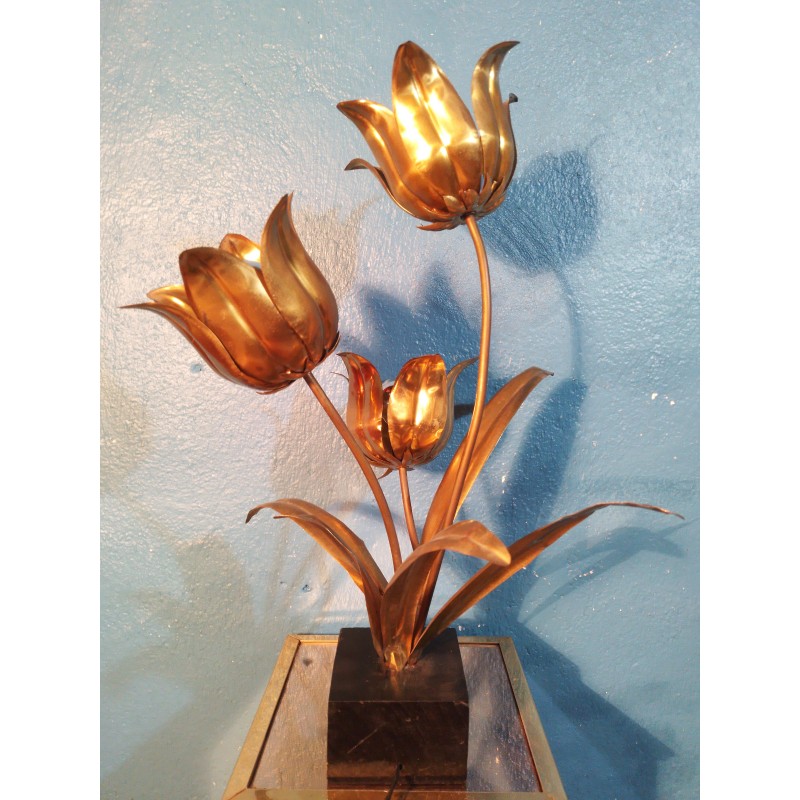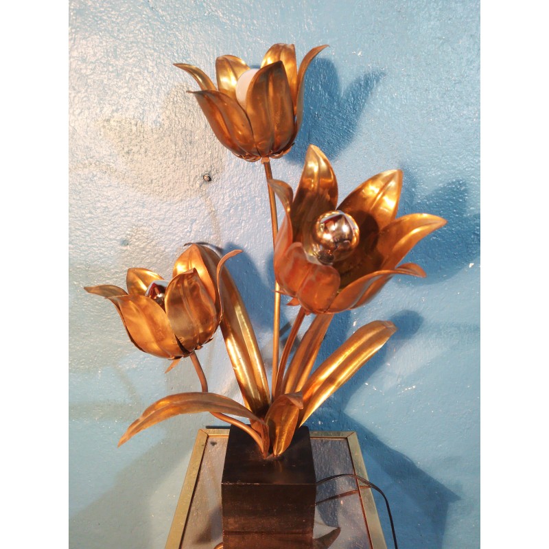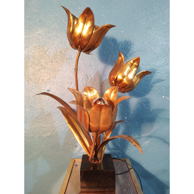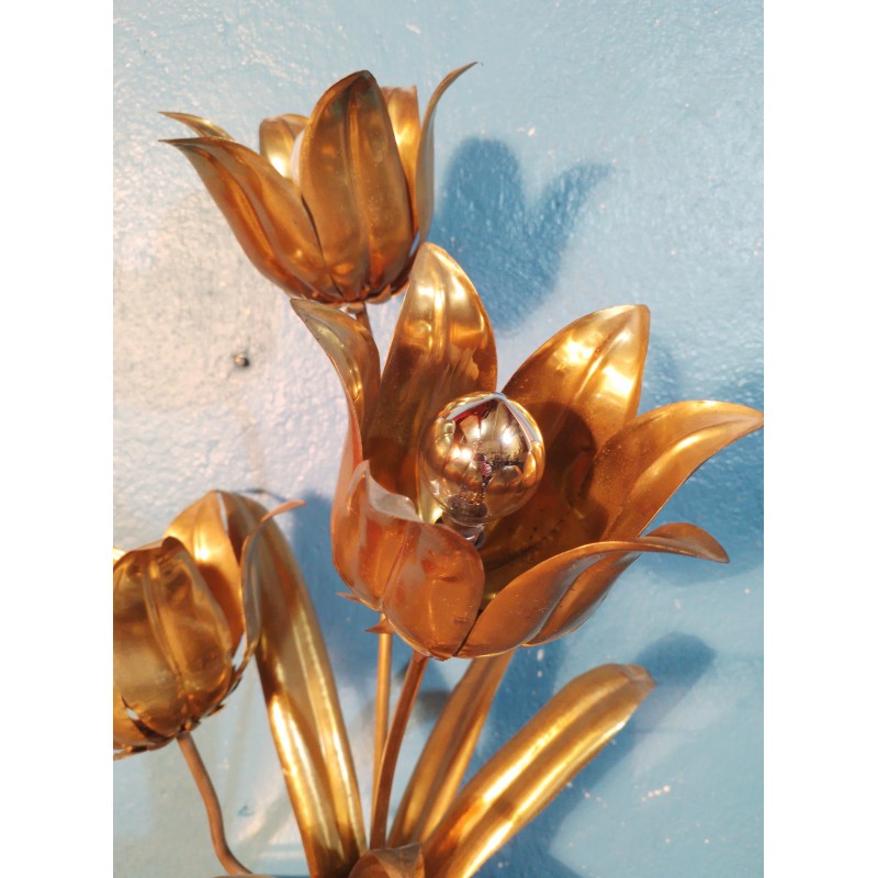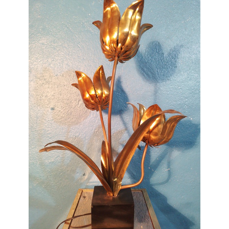 Le coup de coeur pour cette ravissante lampe "fleur" ! Editée en france dans les années 70, modèle à 3 feux avec pétales, tiges et feuilles en métal doré, sur socle carré en bois couleur noir.. Originale & décorative, elle sera parfaite pour une décoration intimiste !