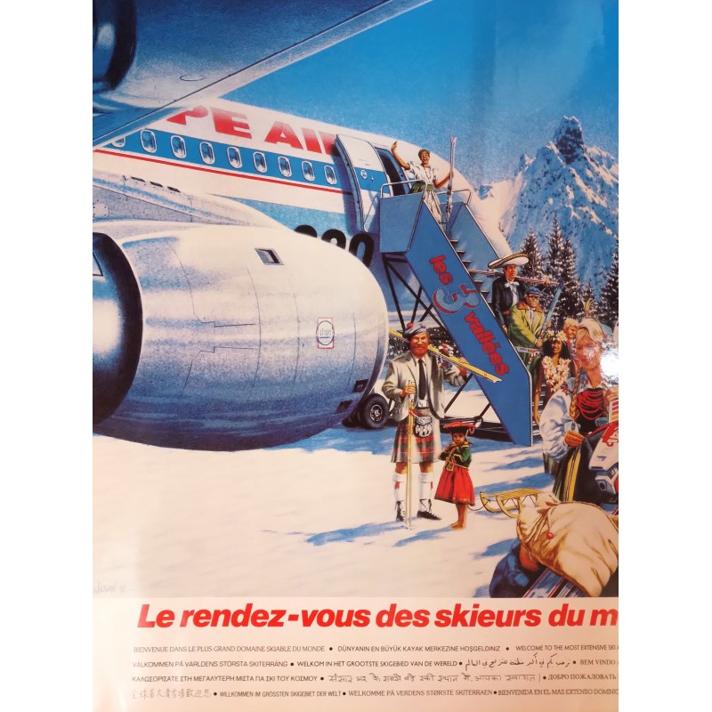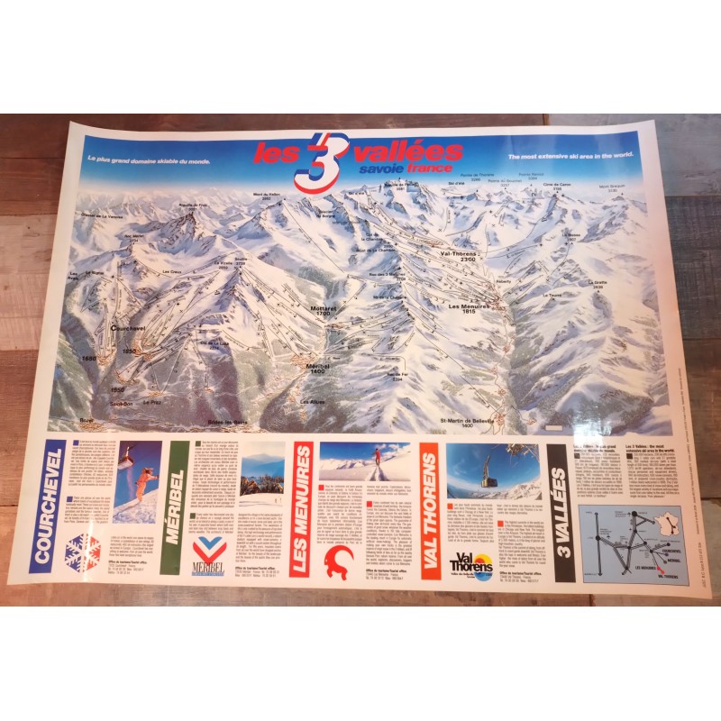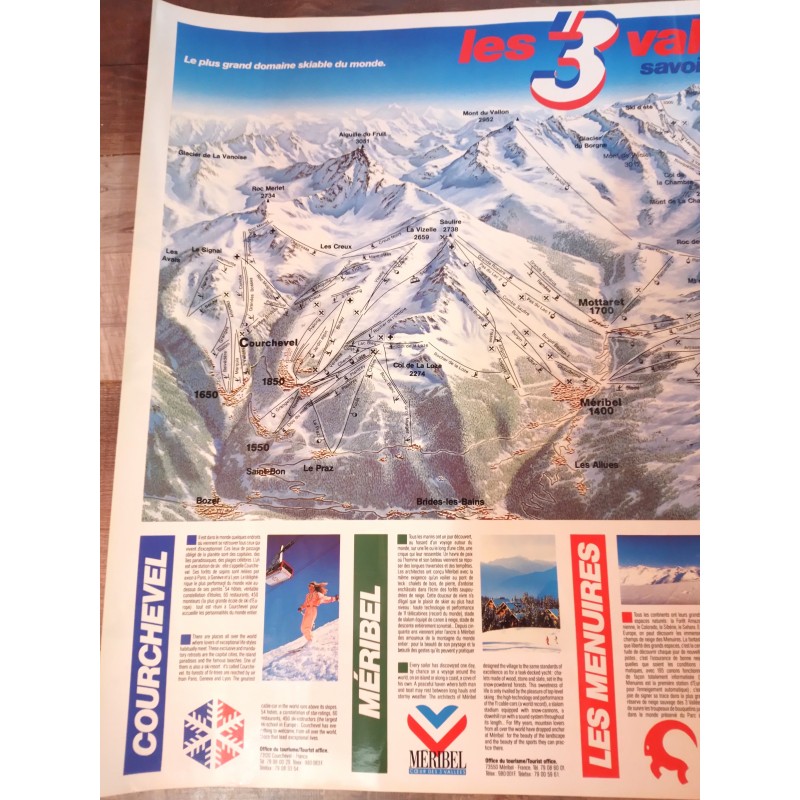 Superbe affiche promotionnelle pour "le Domaine des 3 vallées" ! Editée en 1988, modèle intitulé "Le rdv des skieurs du monde entier", tirage offset imprimé en couleur sur papier glacé avec au resto une illustration signée par Gil & Michel Jouin et au verso le plan des pistes du domaine comprenant Courchevel, Les Ménuires, Val Thorens & Meribel.. Une pièce rare !
