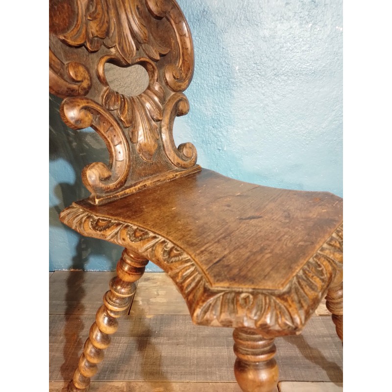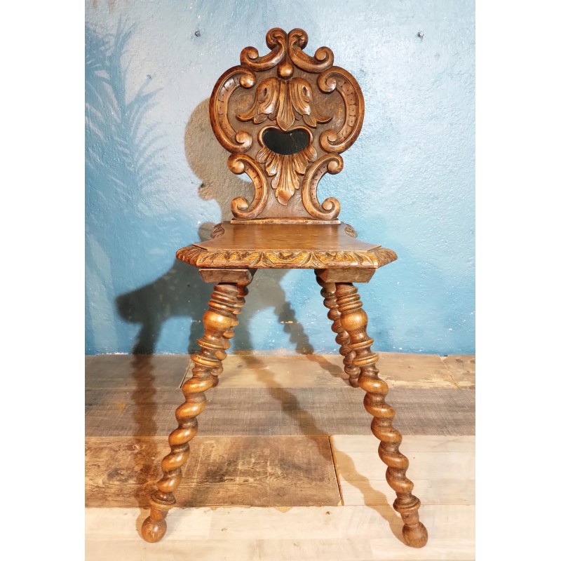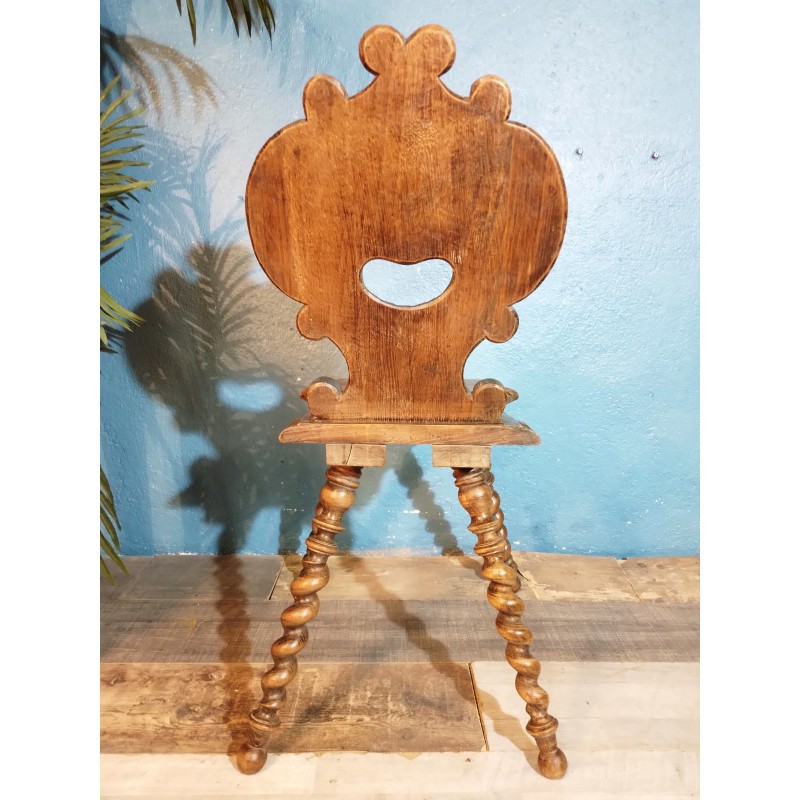 En provenance des montagnes Suisses, ravissante chaise dite escabelle de la fin du XIXème siècle ! Modèle en noyer avec assise carrée, dossier ajouré à décor sculpté, piétement torsadé.. Elégante & décorative, elle trouvera facilement sa place !
