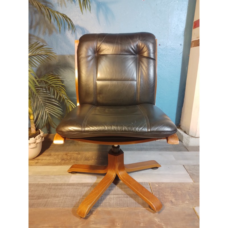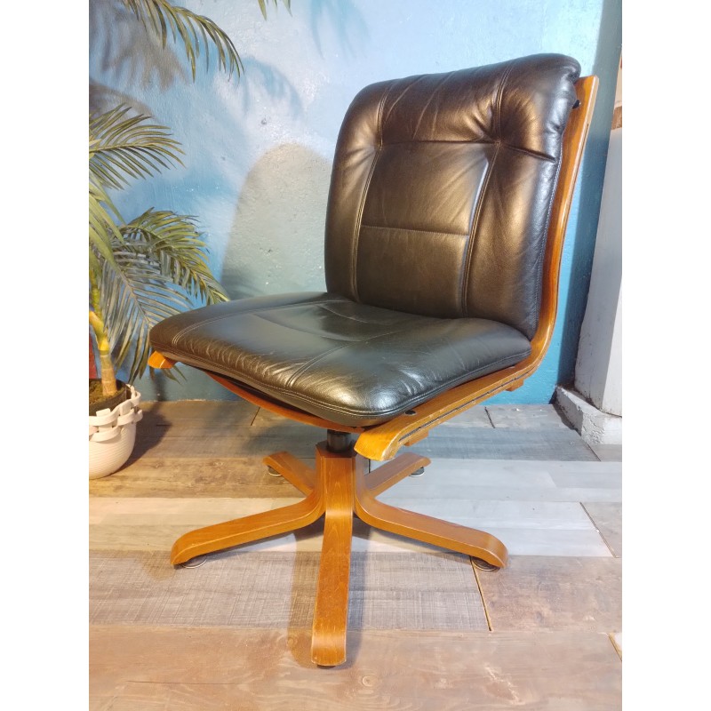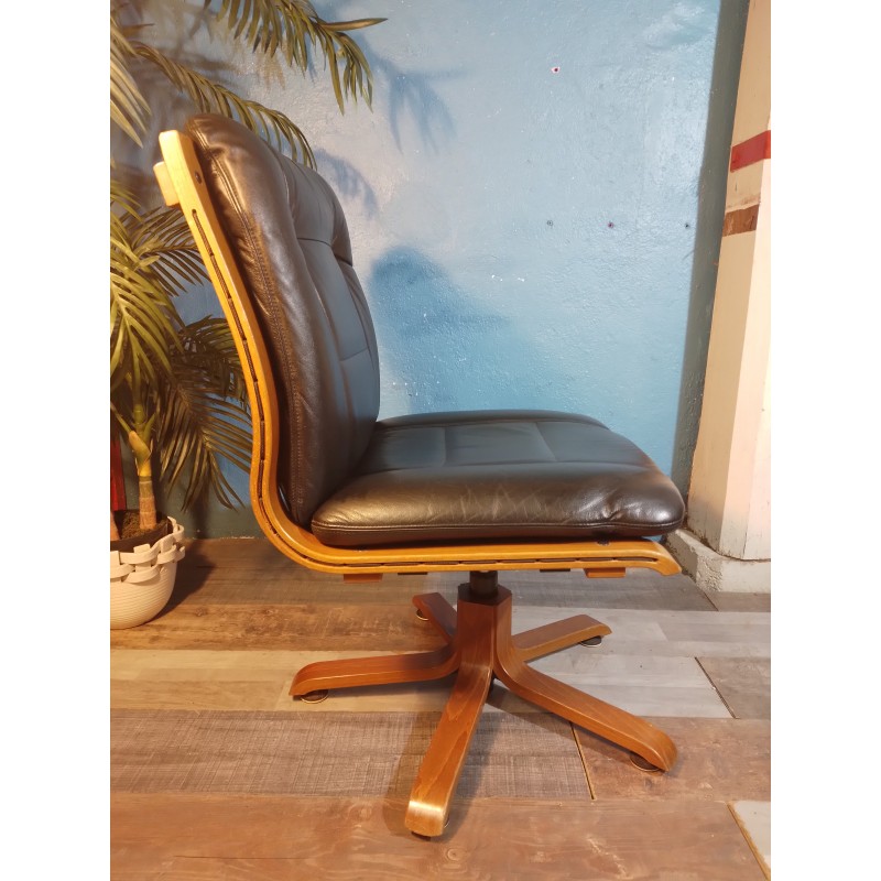 Le coup de coeur pour ce superbe fauteuil de bureau ! Edité dans les années 70 par l'entreprise Italienne Co.Fe.Mo, modèle pivotant, se composant d'une armature en teck blond courbé associée à une assise et à un dossier en cuir noir, pied étoile, barre de force pour un retour automatique en position, à noter le très joli laçage de fixation habilement logé dans les rainures.. Elégant & très confortable !